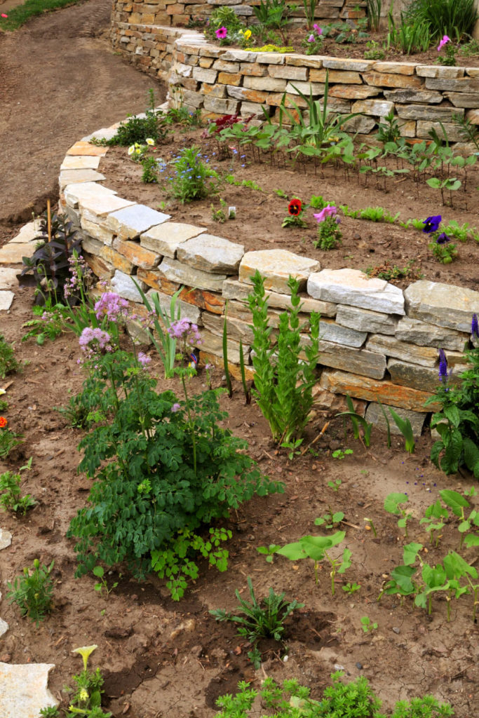 Çimenlerden kolayca ayırt edilebilen özel dikim yatakları yaratan kısa bir istinat duvarı.