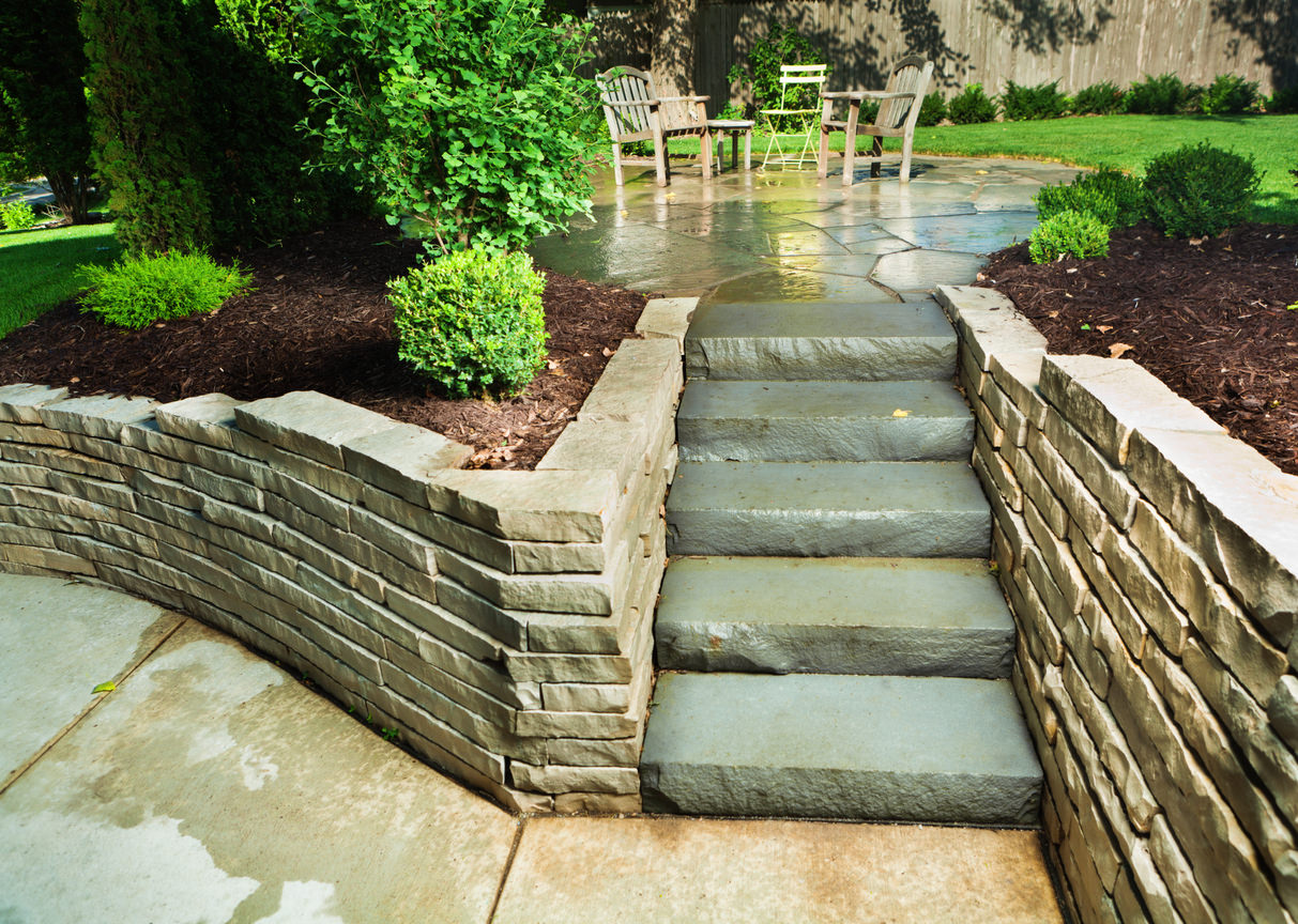 Landscaped Garden Back Yard Patio with Stone Paving Steps, Wall